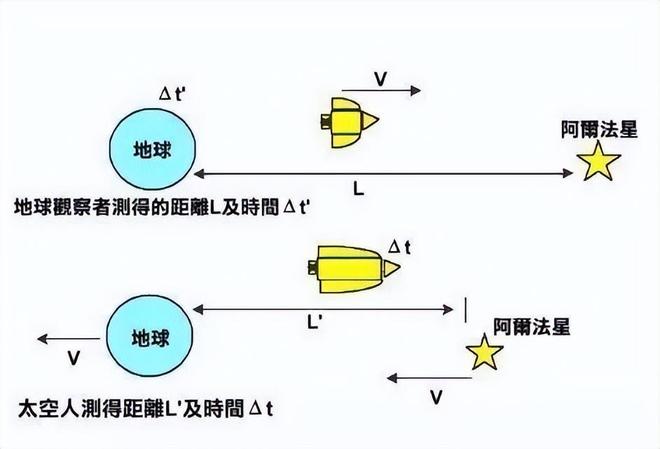但从飞船上宇航员的视角来看,情况则完全不同:在宇航员眼中,飞船是静止的,反而是地球和比邻星在以0.99c的速度向相反方向运动。更重要的是,由于“尺缩效应”(狭义相对论的另一核心效应,即运动方向上的空间会发生收缩),宇航员观测到的地球与比邻星之间的距离会大幅缩短——不再是4.2光年,而是约0.59光年(计算方式:l = 4.2光年 × √(1 - 0.99²) ≈ 0.59光年)。因此,以0.99c的速度跨越0.59光年的距离,宇航员感知到的飞行时间仅约0.59年(计算方式:t = 0.59光年 / 0.99c ≈ 0.59年)。