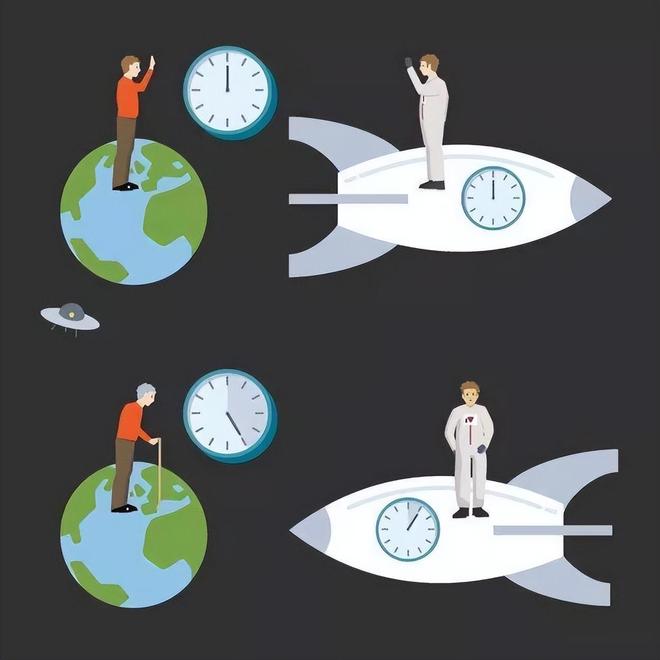 这里需要特别澄清一个经典的相对论悖论——“双生子佯谬”。很多人会基于上述例子提出疑问:地球观察者看到宇航员的时间变慢,而宇航员也看到地球观察者的时间变慢,这两种观测结果是相互矛盾的吗?如果宇航员驾驶亚光速飞船飞行一段时间后返回地球,到底是宇航员更年轻,还是地球上的双胞胎兄弟更年轻?
