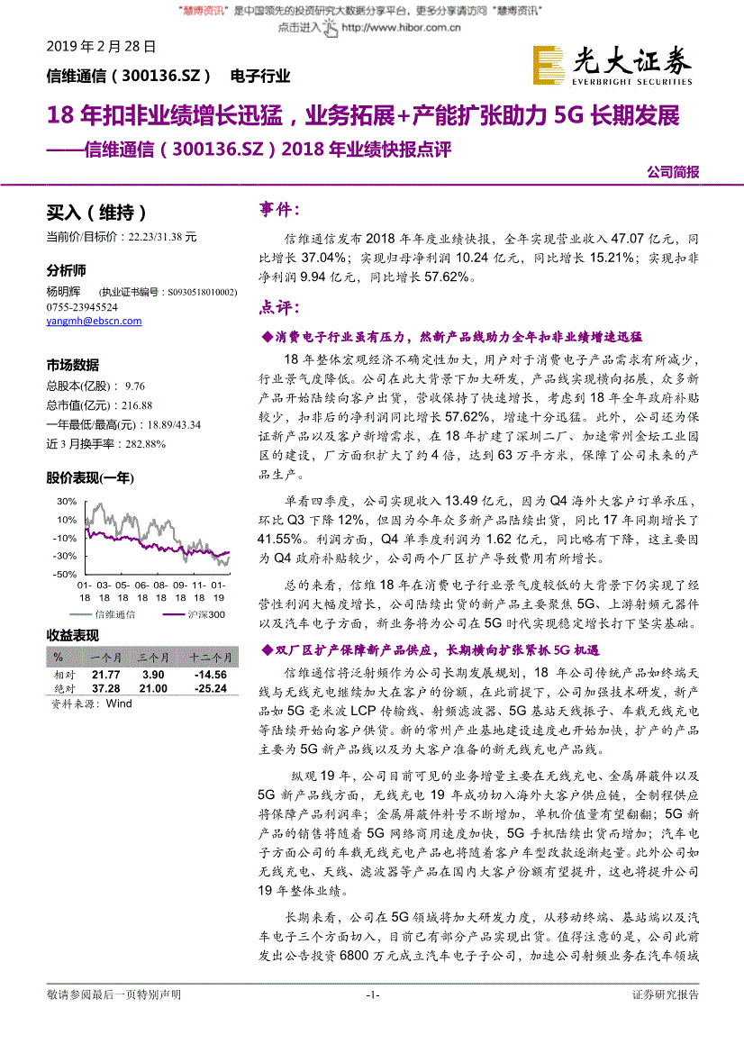 -1-证券研究报告2019年2月28日信维通信(300136.SZ)电子行业18年扣非业绩增长迅猛,业务拓展+产能扩张助力5G长期发展——信维通信(300136.SZ)2018年业绩快报点评 公司简报 买入(维持) 当前价/目标价:22.23/31.38元分析师杨明辉(执业证书编号:S02) 市场数据总股本(亿股):9.76 总市值(亿元):216.88 一年最低/最高(元):18.89/43.34 近3月换手率:282.88% 股价表现(一年) -50% -30% -10% 10% 30% 01- 18 03- 18 05- 18 06- 18 08- 18 09- 18 11- 18 01- 19信维通信沪深300 收益表现%一个月三个月十二个月相对21.773.90 -14.56 绝对37.2821.00 -25.24 资料来源:Wind 事件:信维通信发布2018年年度业绩快报,全年实现营业收入47.07亿元,同比增长37.04%;实现归母净利润10.24亿元,同比增长15.21%;实现扣非净利润9.94亿元,同比增长57.62%。