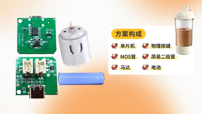 方案的核心部件包括:单片机、马达、物理按键、500mAh电池、MOS管、简易二极管充电,结合精准的电源管理系统与多重安全防护机制,确保搅拌效率提升90%以上。